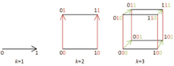 With 2D keys every node has quadrants. The position of the quadrant where a key is stored is extracted from the respective bits of the keys, one bit from each dimension. The four quadrants of the node form a 2D hypercube (quadrants may be empty). The bits that are extracted from the keys form the hypercube address , for and for . is effectively the position of the quadrant in the node's hypercube.[citation needed]